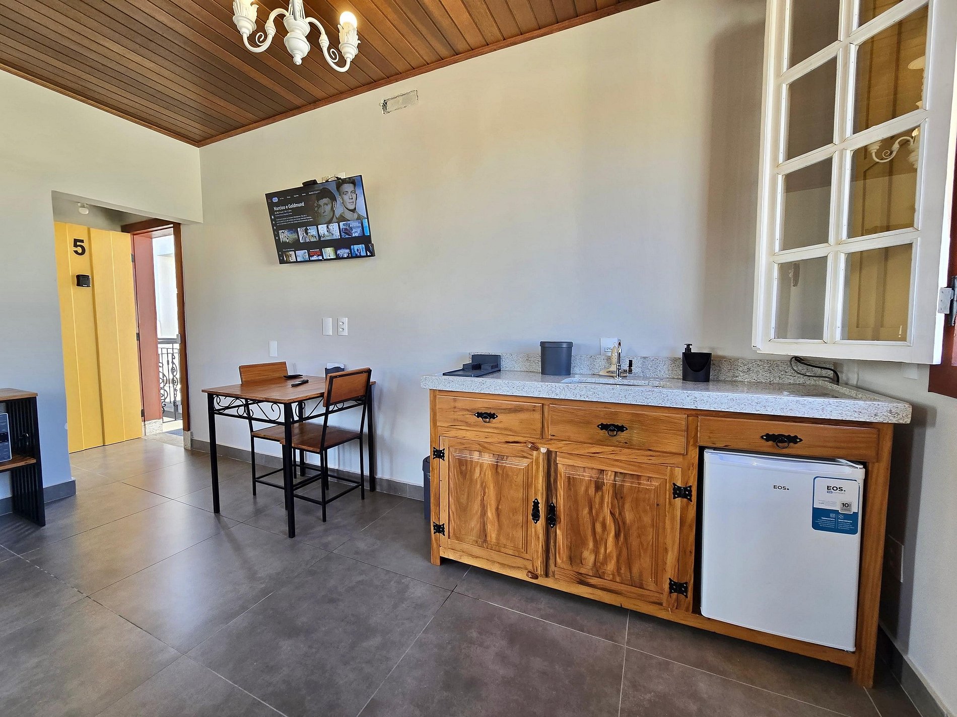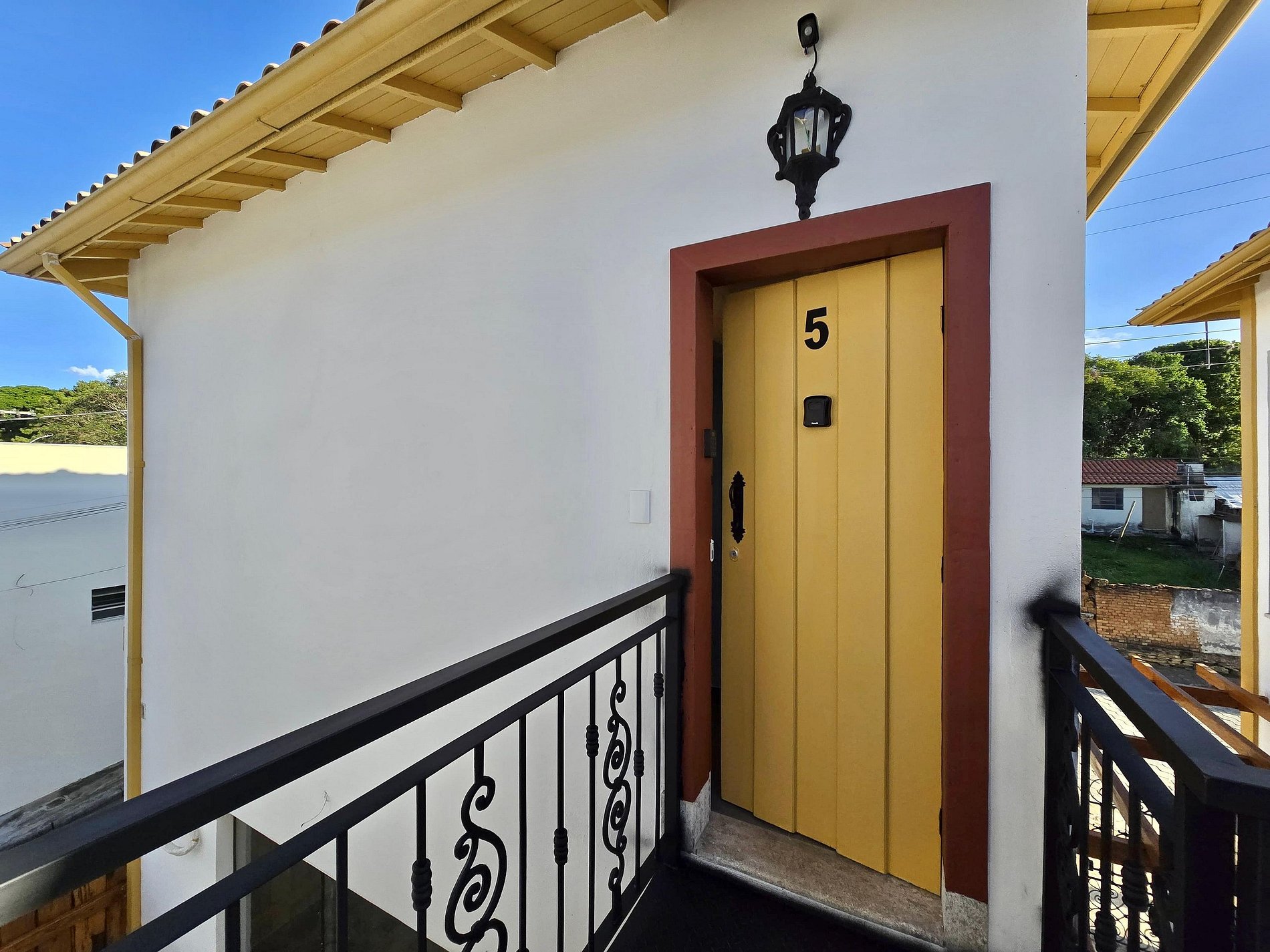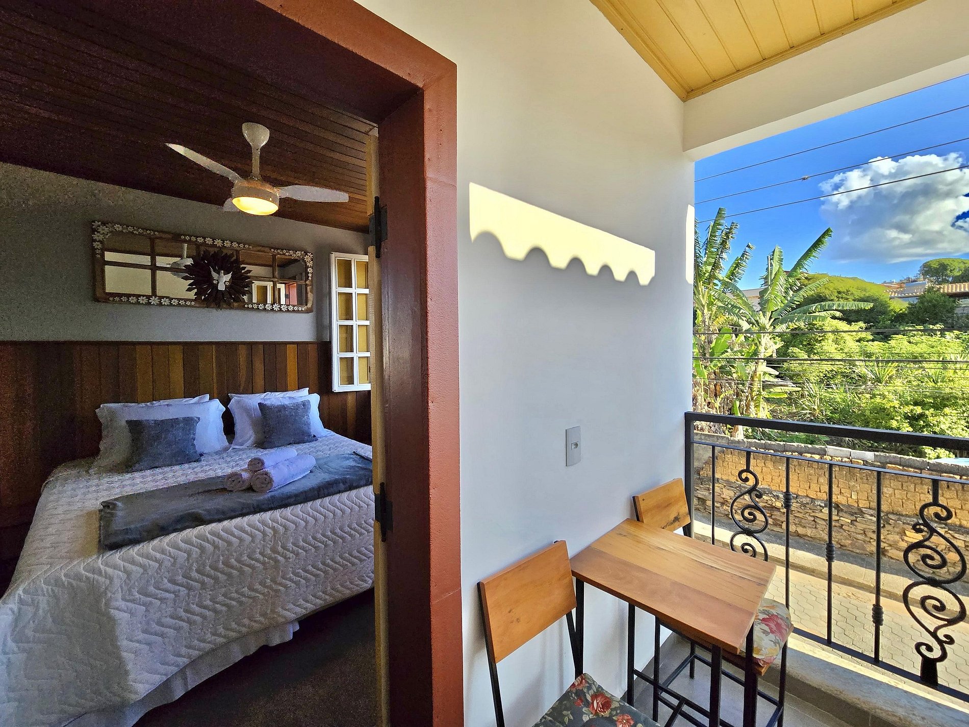 Suíte 5: cama de casal queen, tv com streaming, ventilador de teto, arara para roupas, cabides, mesa com duas cadeiras, microondas, frigobar, copo, taças e talheres, banheiro com secador de cabelo, varanda e vaga de estacionamento privativa.