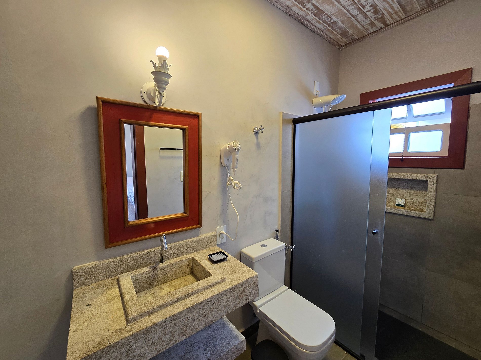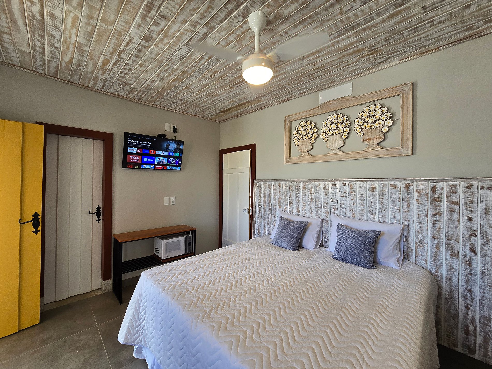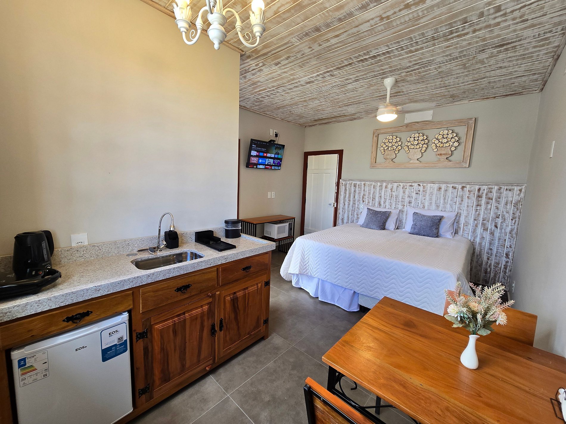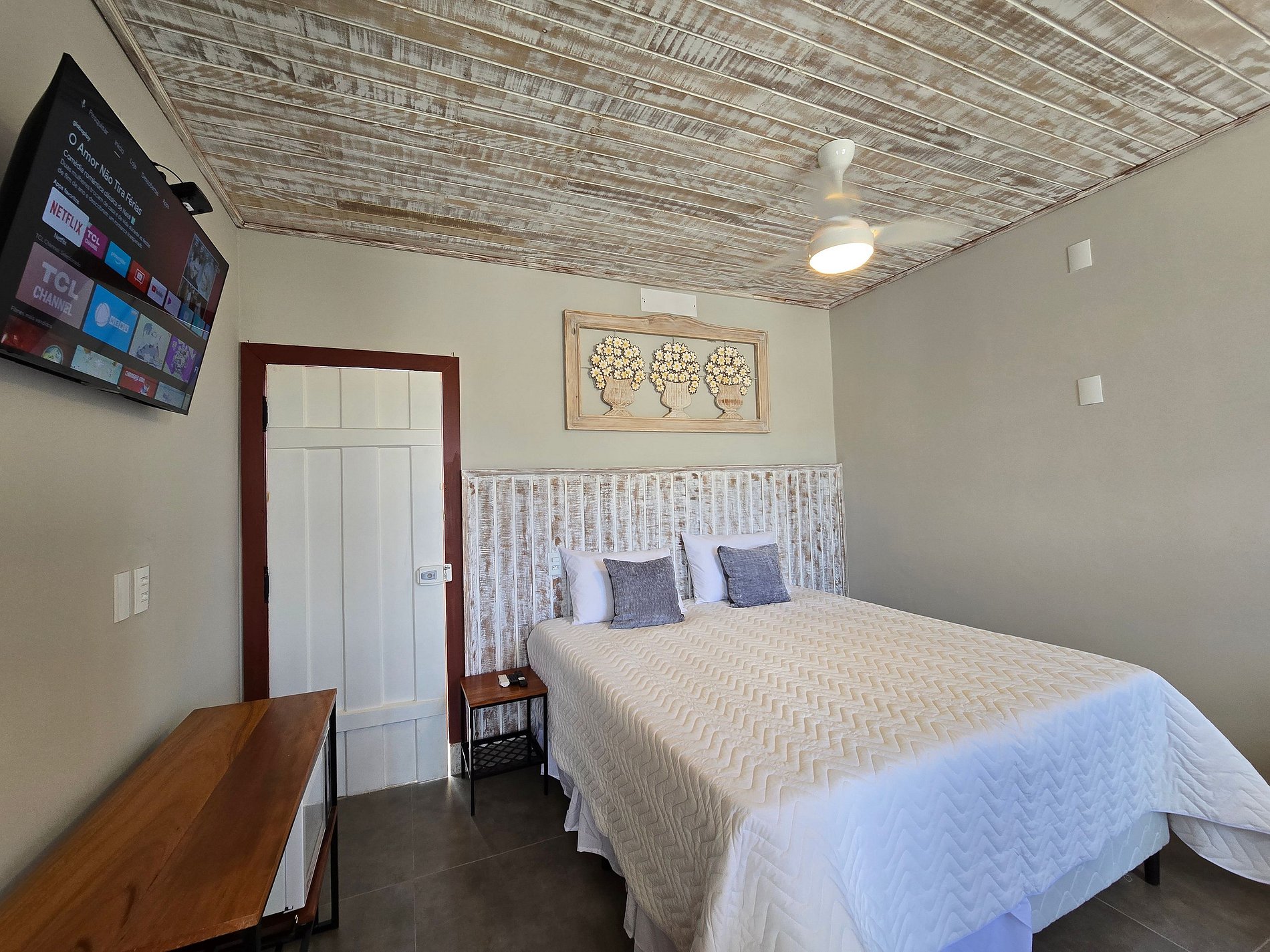 Suíte 3: cama de casal queen, tv com streaming, ventilador de teto, arara para roupas, cabides, mesa com duas cadeiras, microondas, frigobar, copo, taças e talheres, banheiro com secador de cabelo, varanda e vaga de estacionamento privativa.
