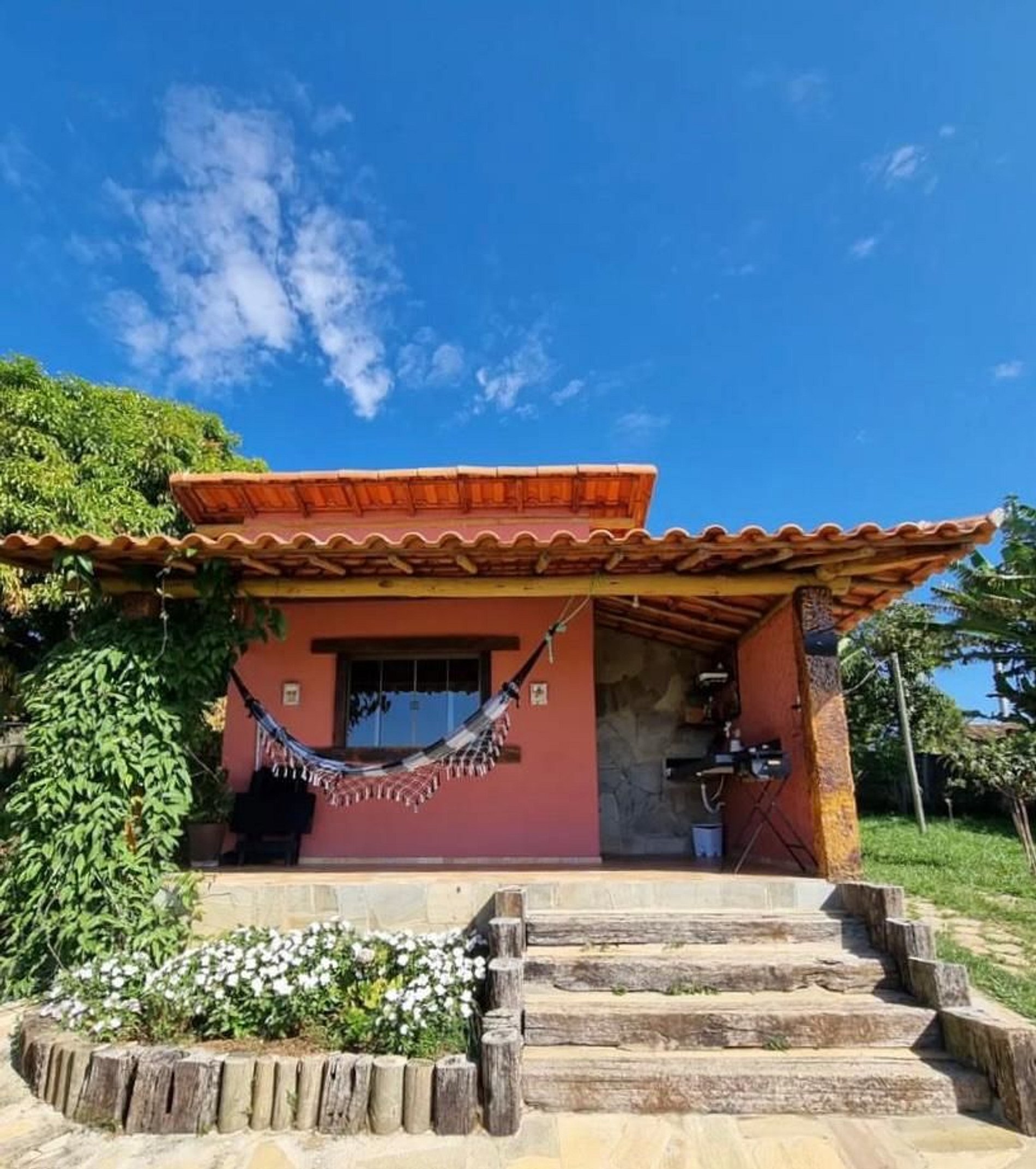 🔴 Chalé 405 (casal) - terraço com rede, TV de tela plana, área para refeições, fogão de duas bocas externo, frigobar, banheiro privativo e vaga de estacionamento