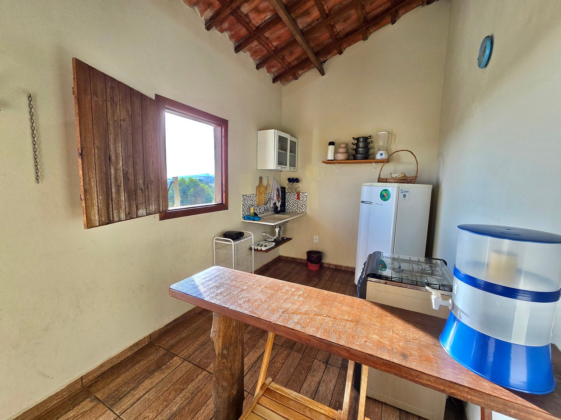 Todos os nossos chalés são suítes equipadas com cozinha completa, varanda com rede e churrasqueira.