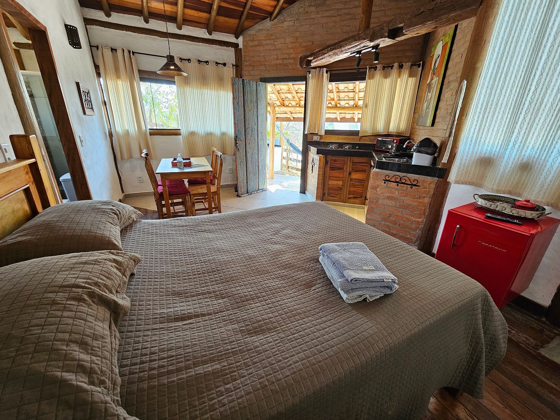 Chalezinho Mata Virgem (2 pessoas): 1 quarto, 1 banheiro, roupa de cama, toalhas, TV de tela plana com serviços de streaming, ar-condicionado, área para refeições, cozinha equipada, fogão cooktop, frigobar, lareia, varanda com rede e churrasqueira.