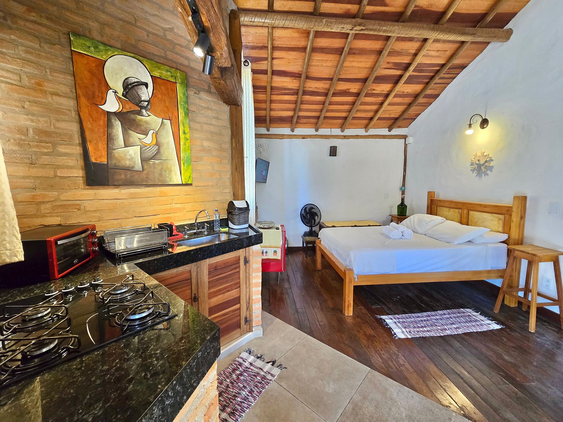 Chalezinho Mata Virgem (2 pessoas): 1 quarto, 1 banheiro, roupa de cama, toalhas, TV de tela plana com serviços de streaming, ar-condicionado, área para refeições, cozinha equipada, fogão cooktop, frigobar, lareia, varanda com rede e churrasqueira.