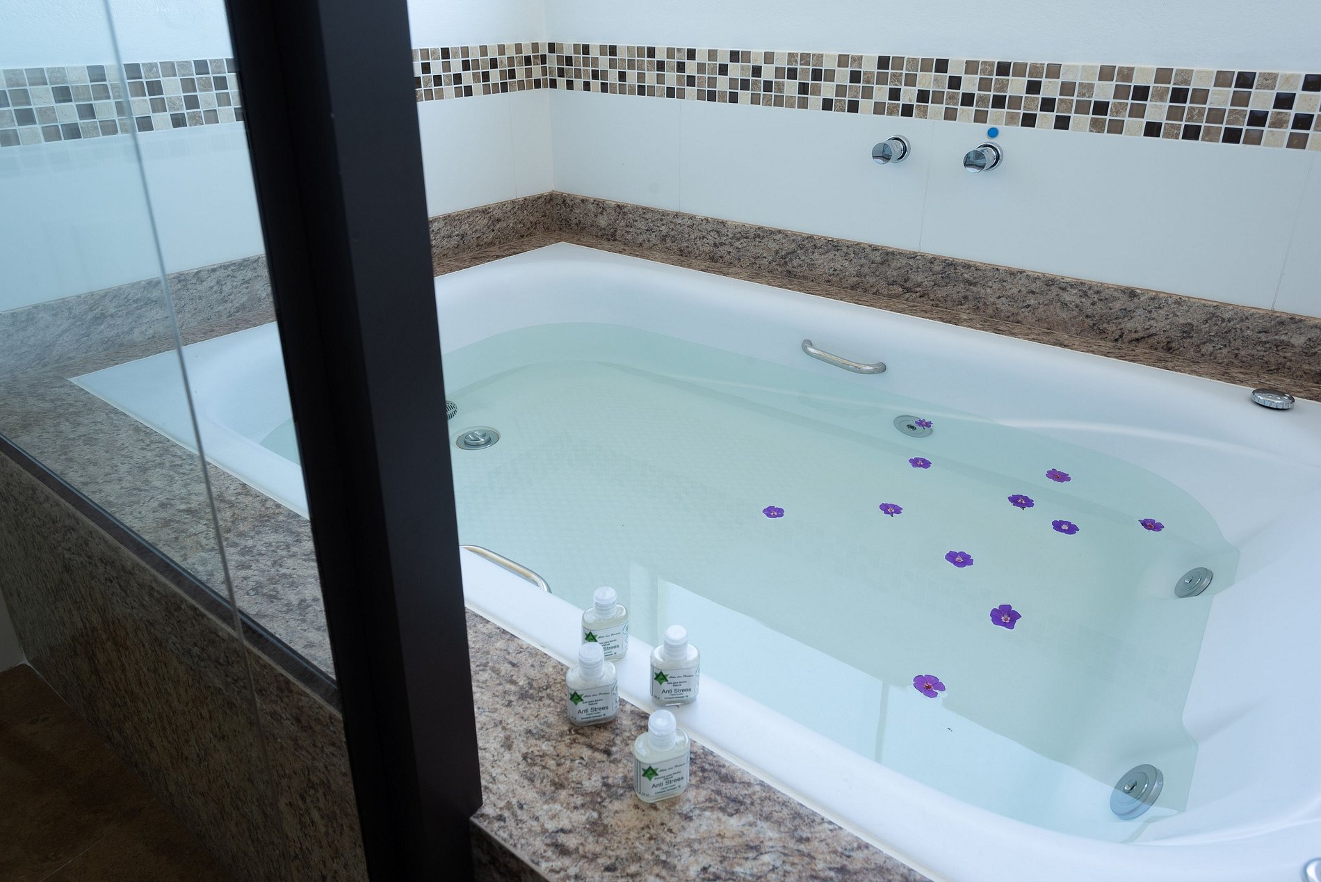 Suíte Premium: cama de casal, banheiro com banheira de hidromassagem, frigobar, ar-condicionado, TV com canais a cabo e mesinha com duas cadeiras (apoio para leptop).