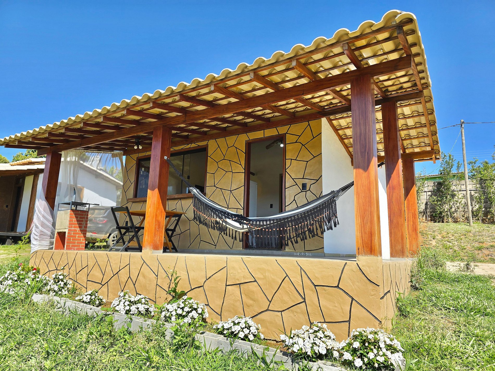 Chalé 407 (casal) - terraço com rede, TV de tela plana, área para refeições, cozinha bem equipada, banheiro privativo e vaga de estacionamento