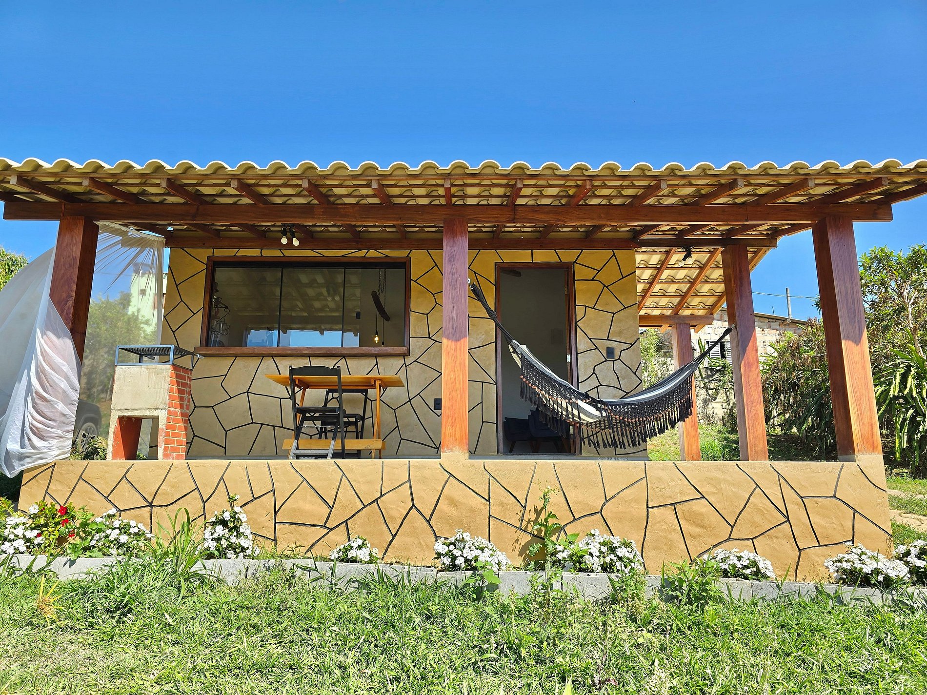 Chalé 407 (casal) - terraço com rede, TV de tela plana, área para refeições, cozinha bem equipada, banheiro privativo e vaga de estacionamento