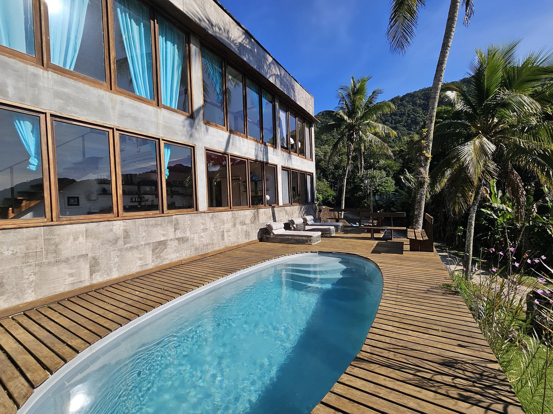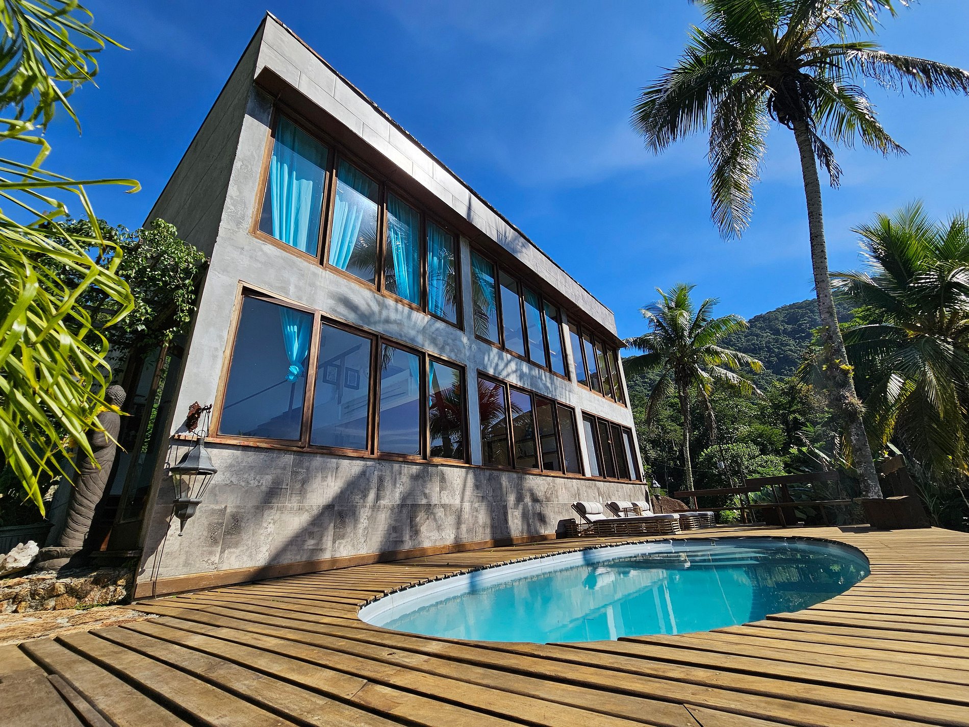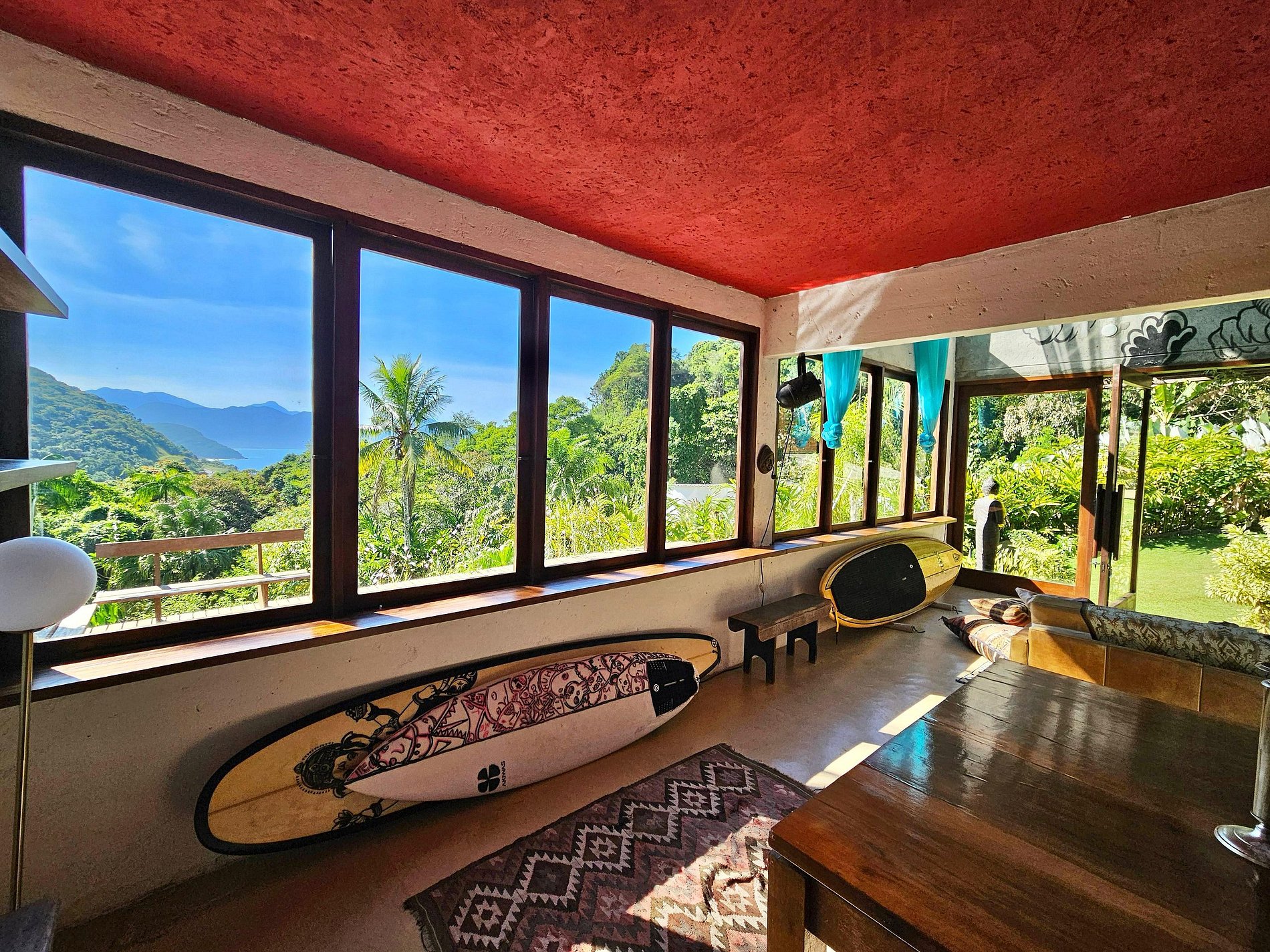 Localizada na Praia do Léo, a casa está cercada pela Mata Atlântica e próxima de diversas praias paradisíacas do litoral norte de São Paulo e sul do Rio, entre Ubatuba e Paraty.