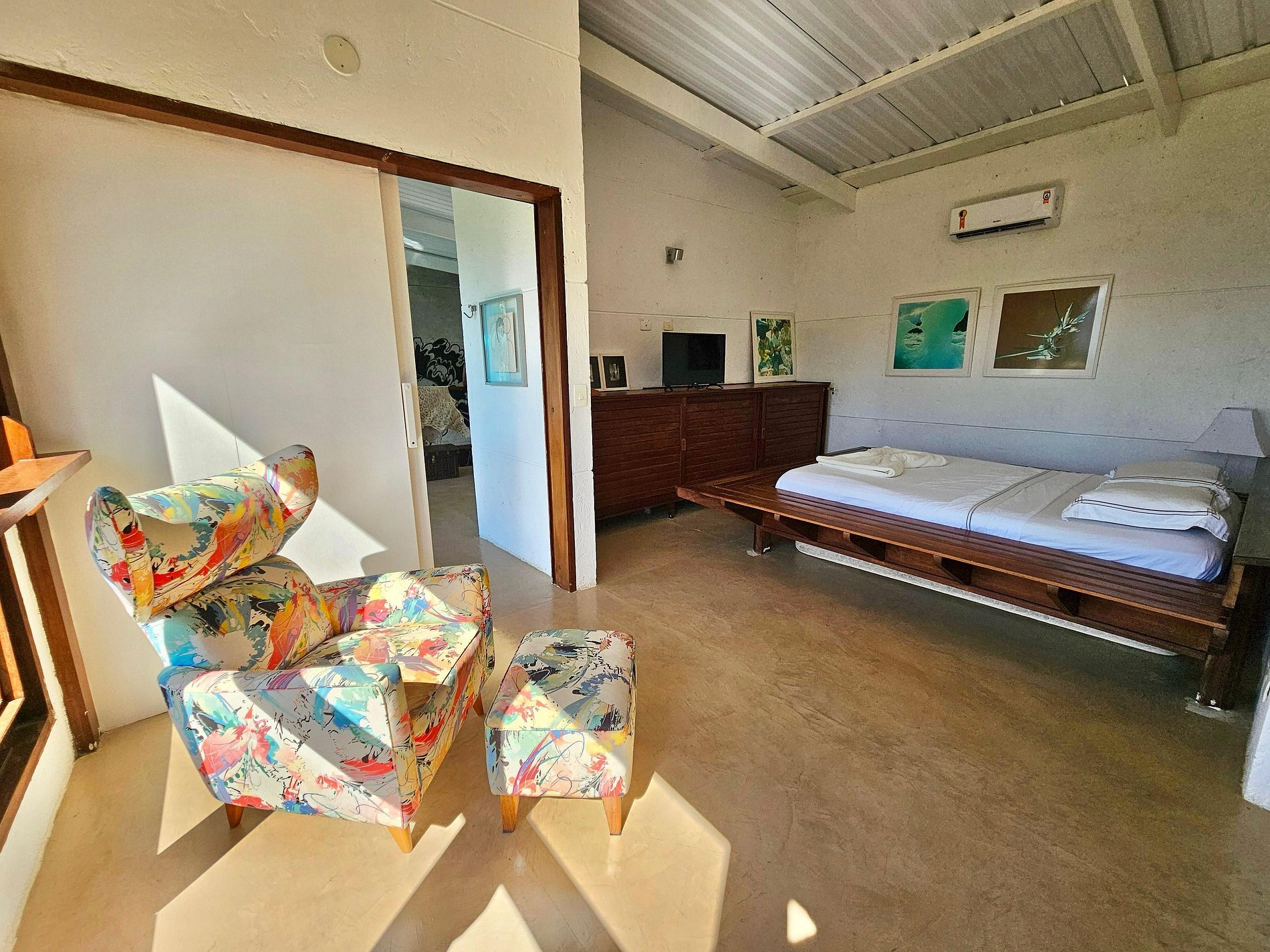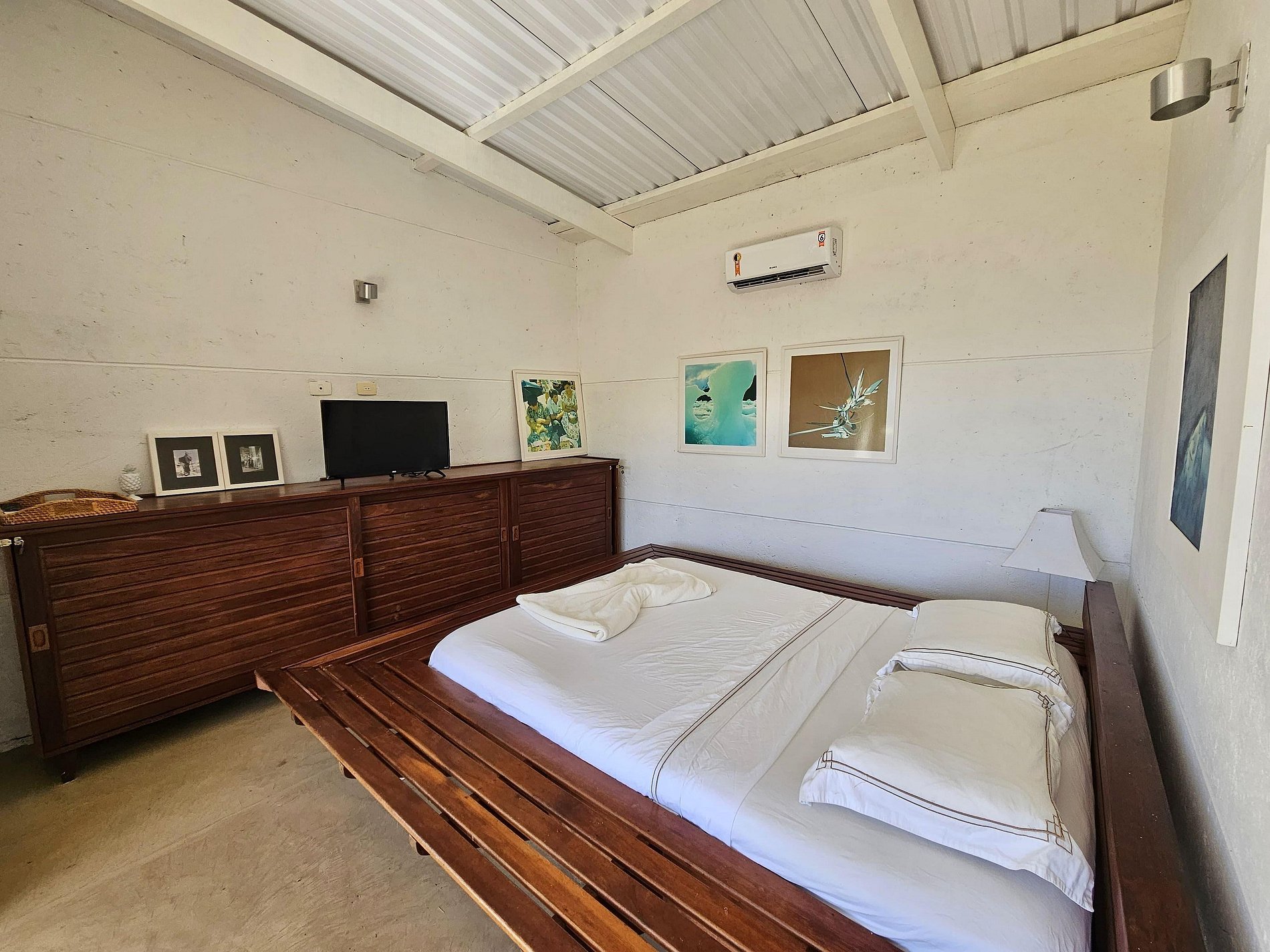 Suíte (andar superior): cama de casal, ar-condicionado, TV, mesa com cadeira para uso de notebook, poltrona em frente a janela, freegobar e banheiro.