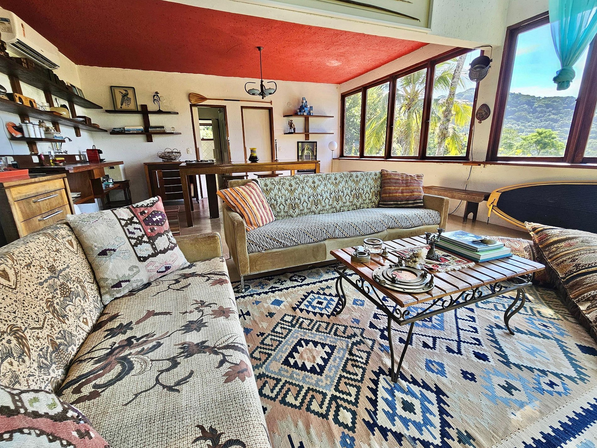 Sala: dois sofás e integrada com a cozinha.