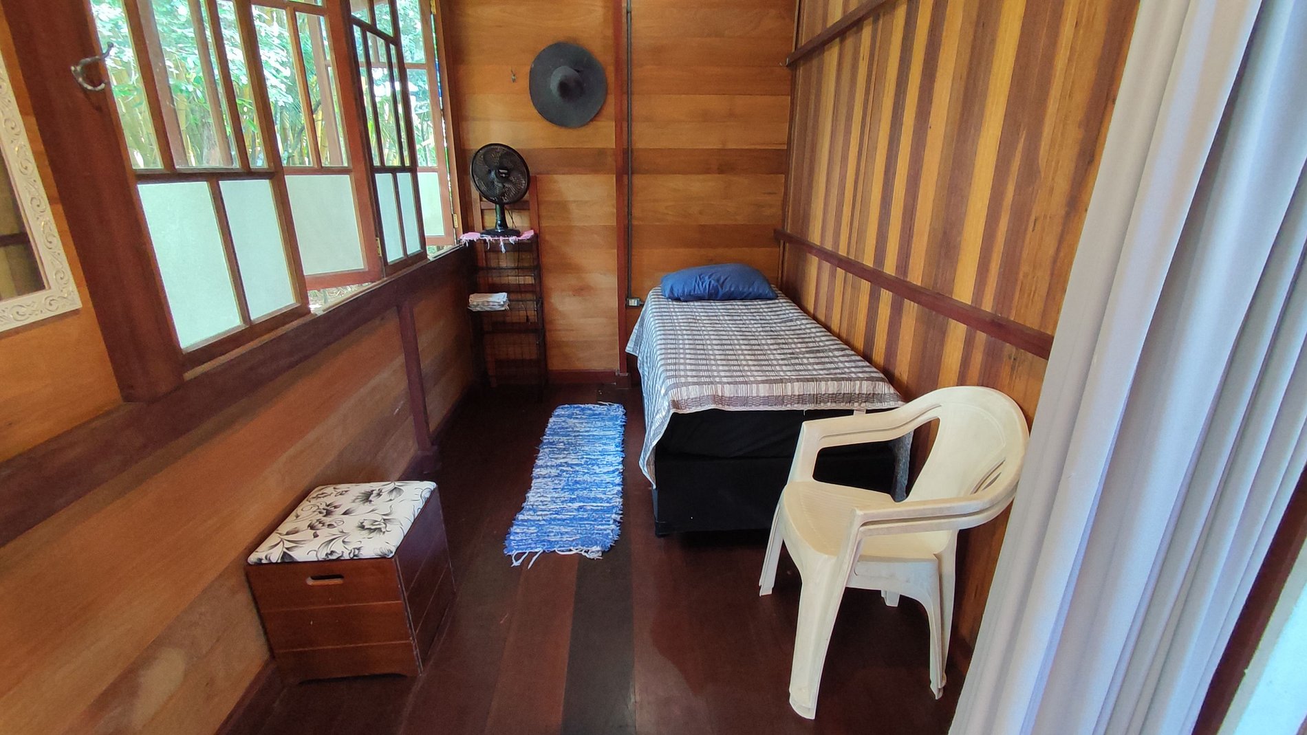 Quarto 2: cama de solteiro, ventilador de chão e vista para a mata.