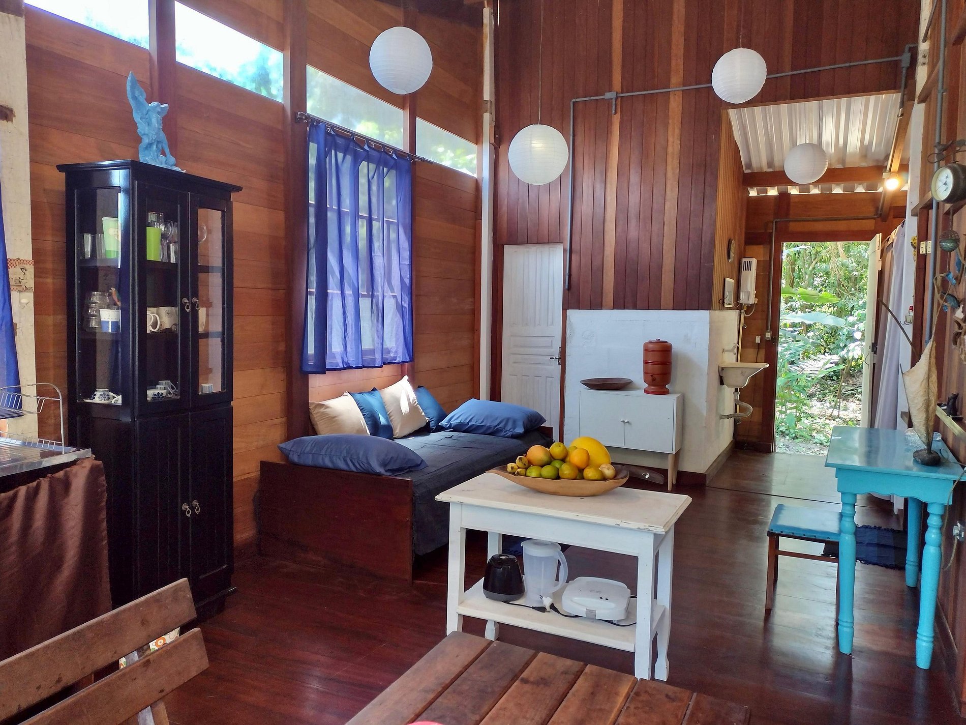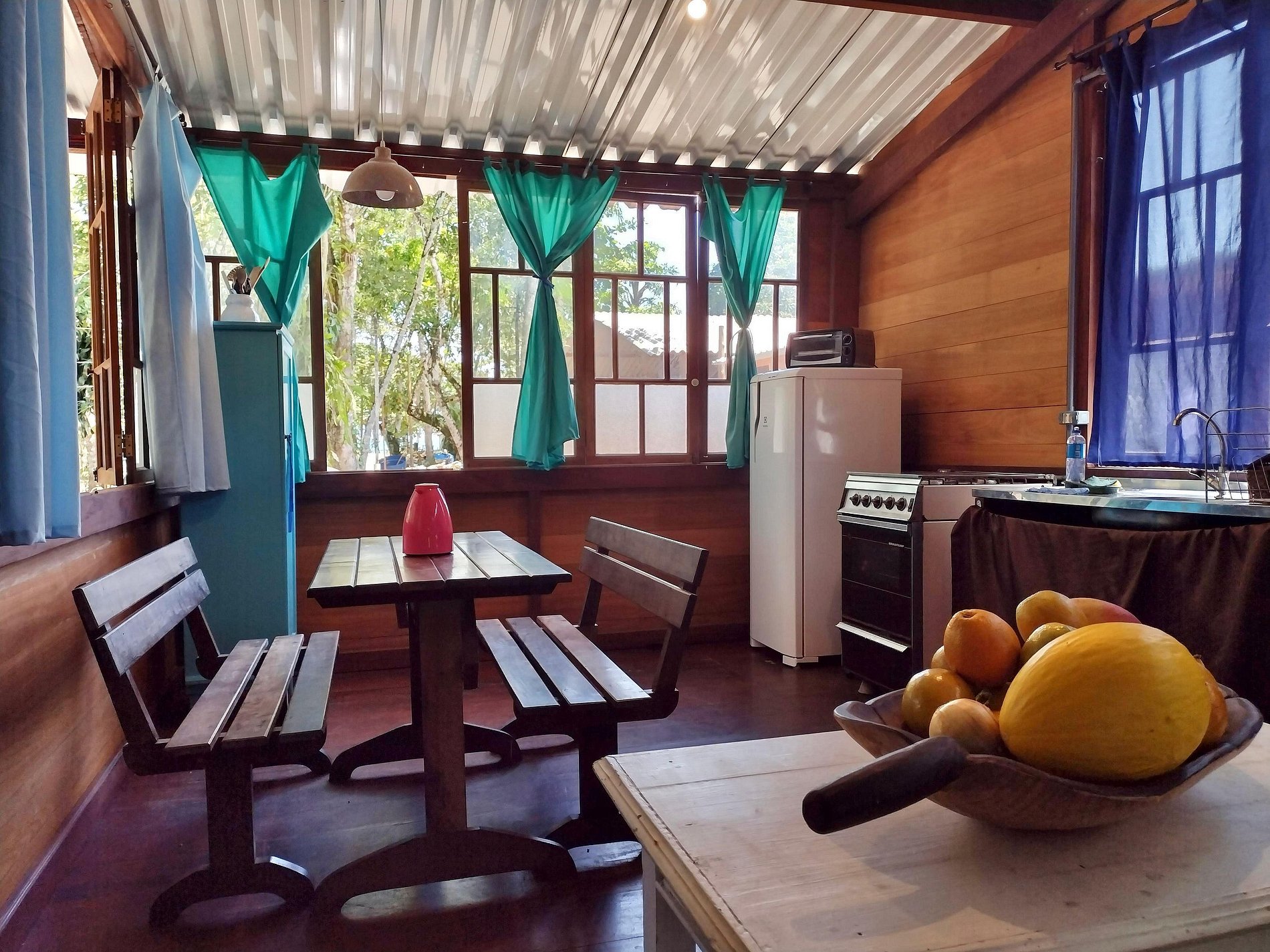 Sala e cozinha integradas: ambiente aconchegante com mesa de refeições, bancos, uma cama de solteiro extra e espaço com mesa para trabalho. Cozinha completa bem equipada com geladeira, fogão, liquidificador, sanduicheira, forninho elétrico e todos os utensílios para café e refeições, taças de vinho, louças, panelas de preção e inox.