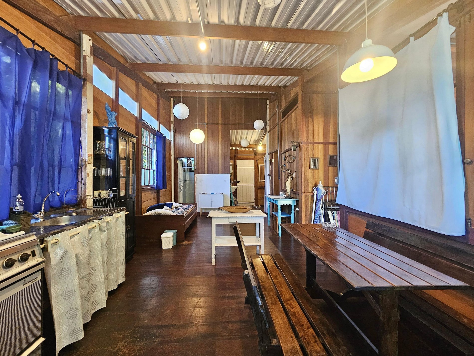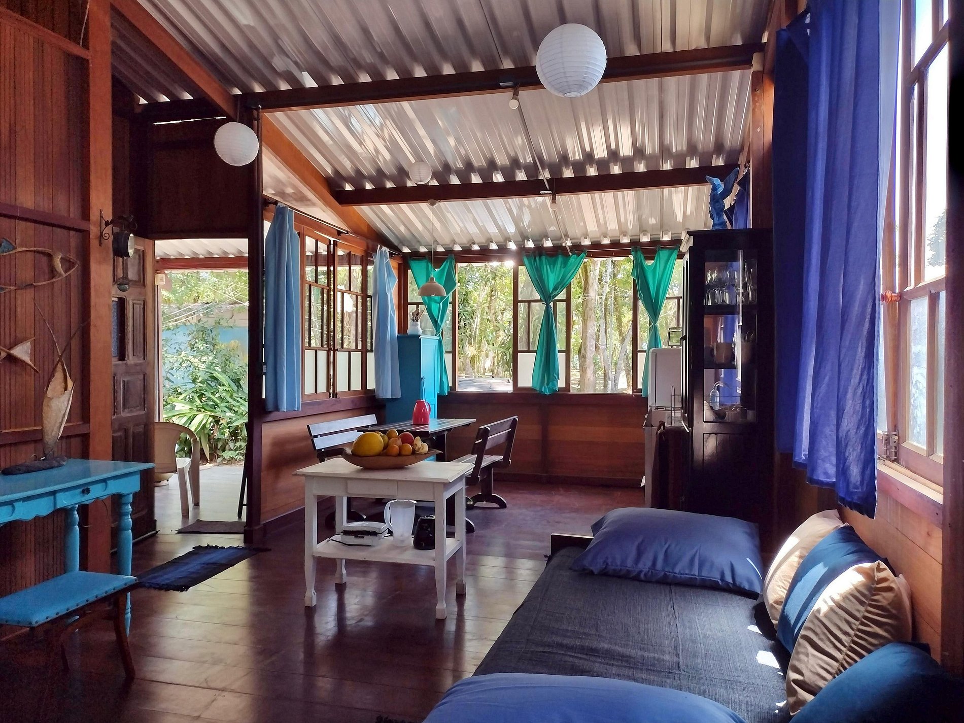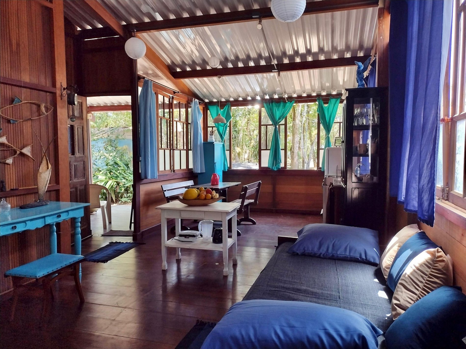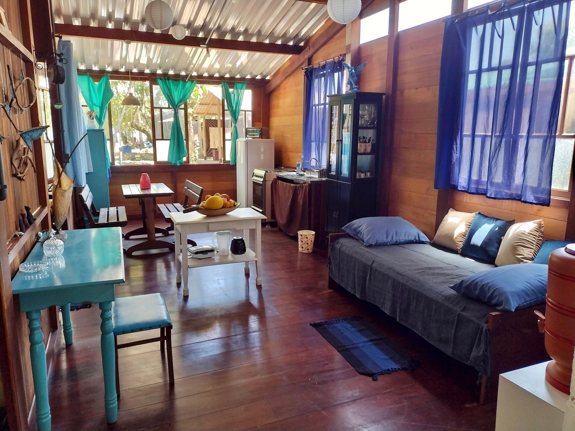 Sala e cozinha integradas: ambiente aconchegante com mesa de refeições, bancos, uma cama de solteiro extra e espaço com mesa para trabalho. Cozinha completa bem equipada com geladeira, fogão, liquidificador, sanduicheira, forninho elétrico e todos os utensílios para café e refeições, taças de vinho, louças, panelas de preção e inox.