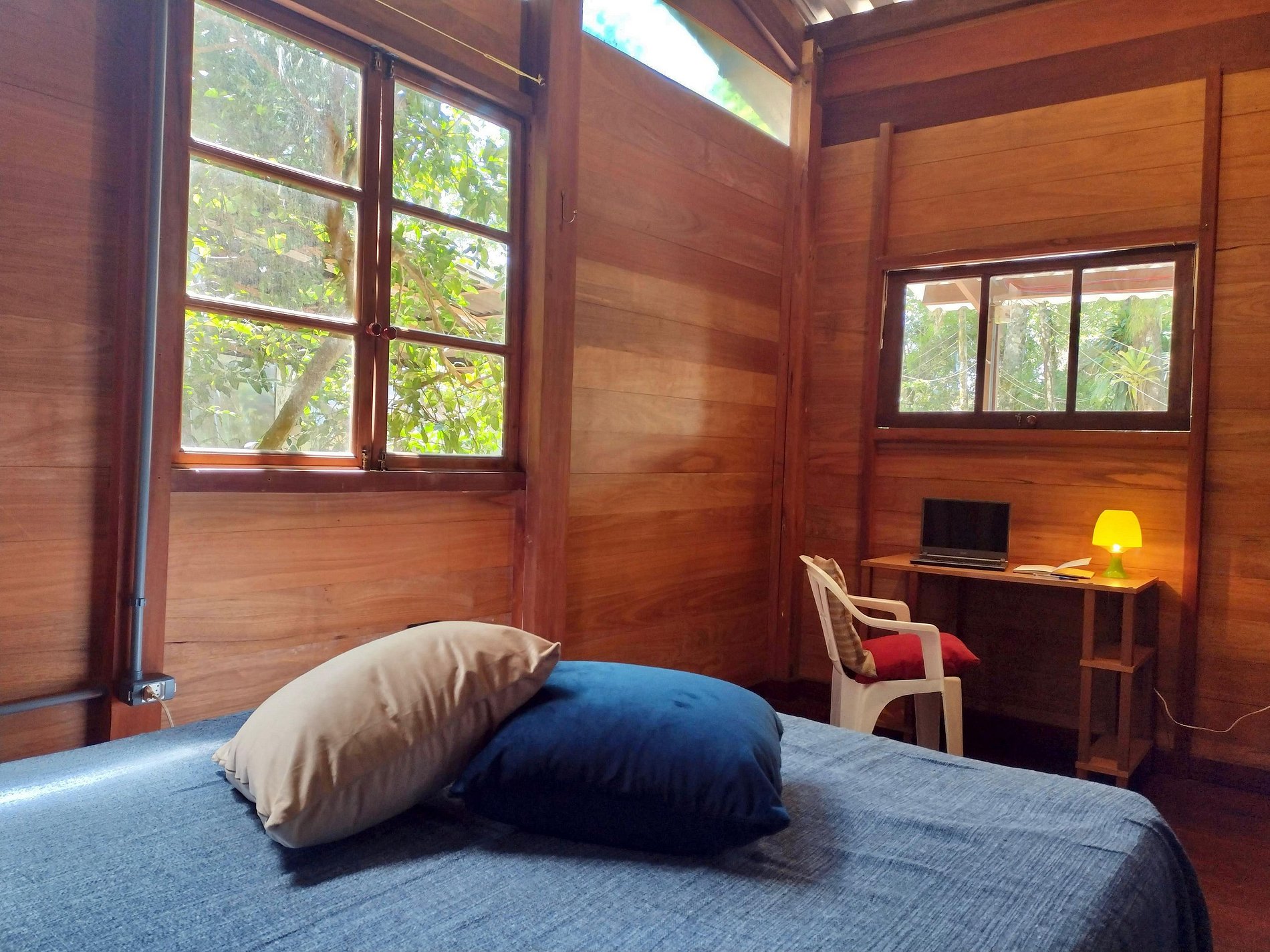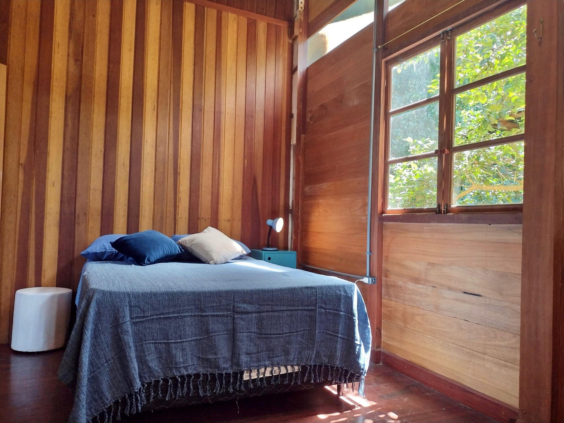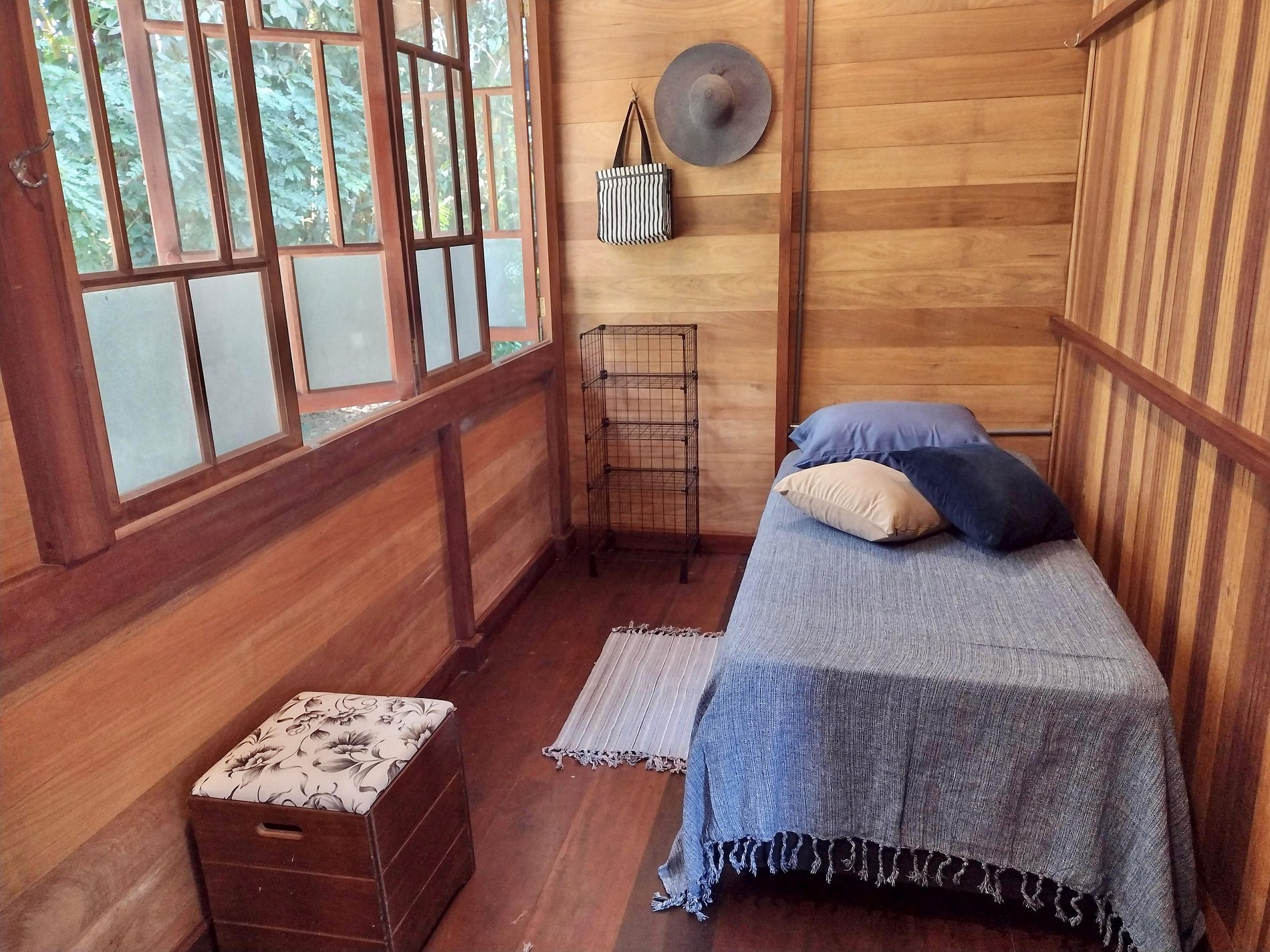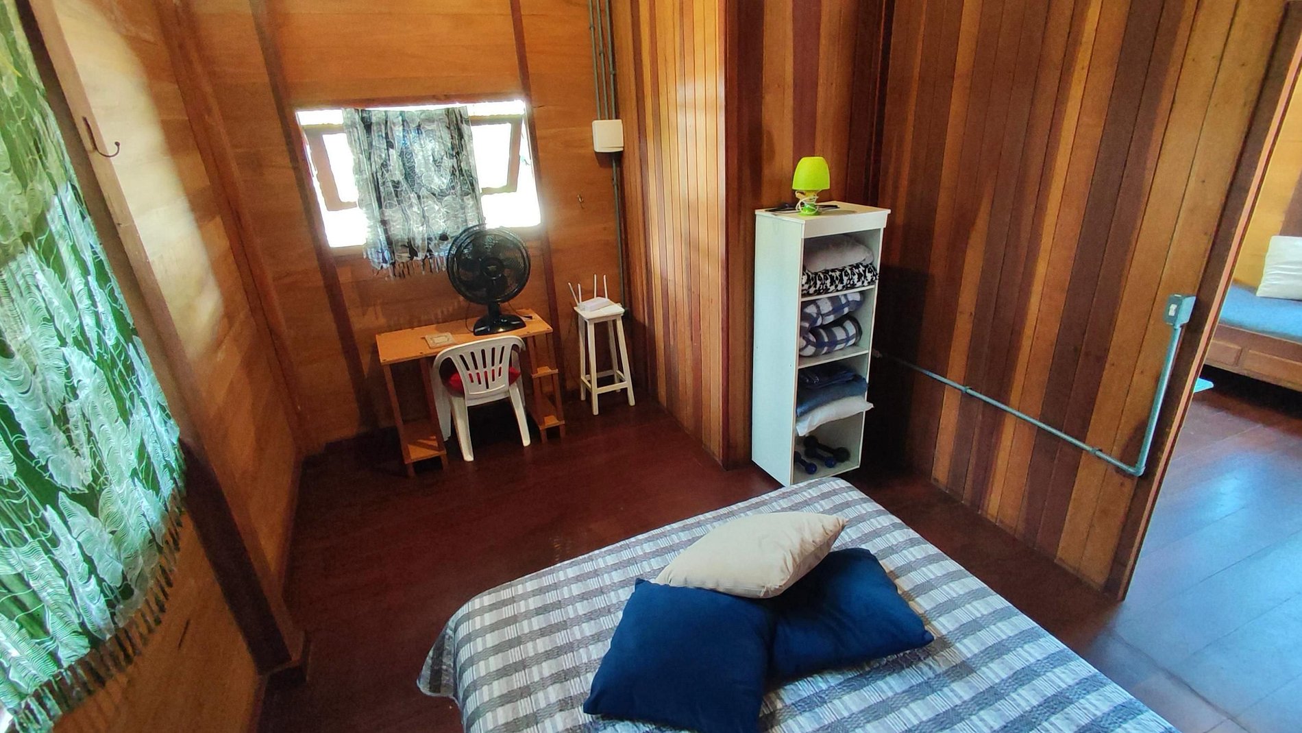 Quarto 2: cama de solteiro, ventilador de chão e vista para a mata.