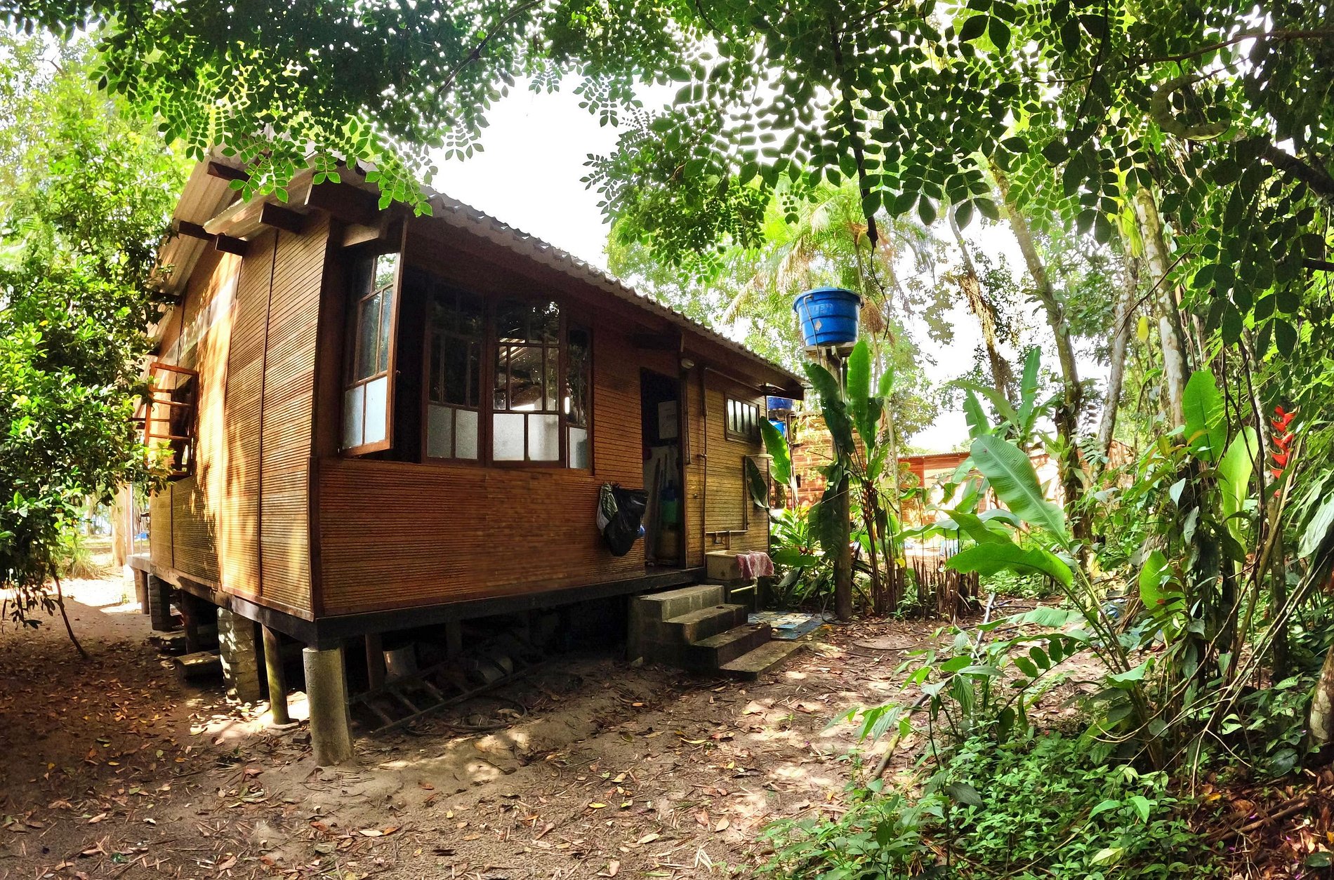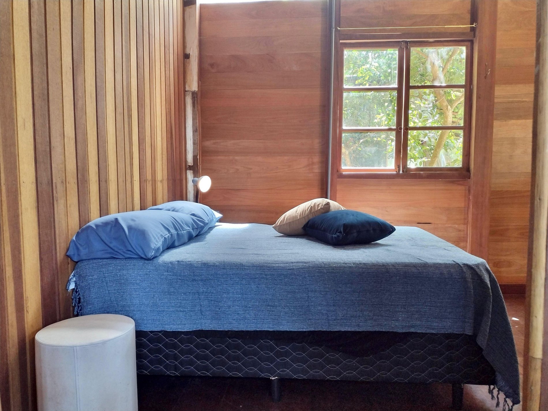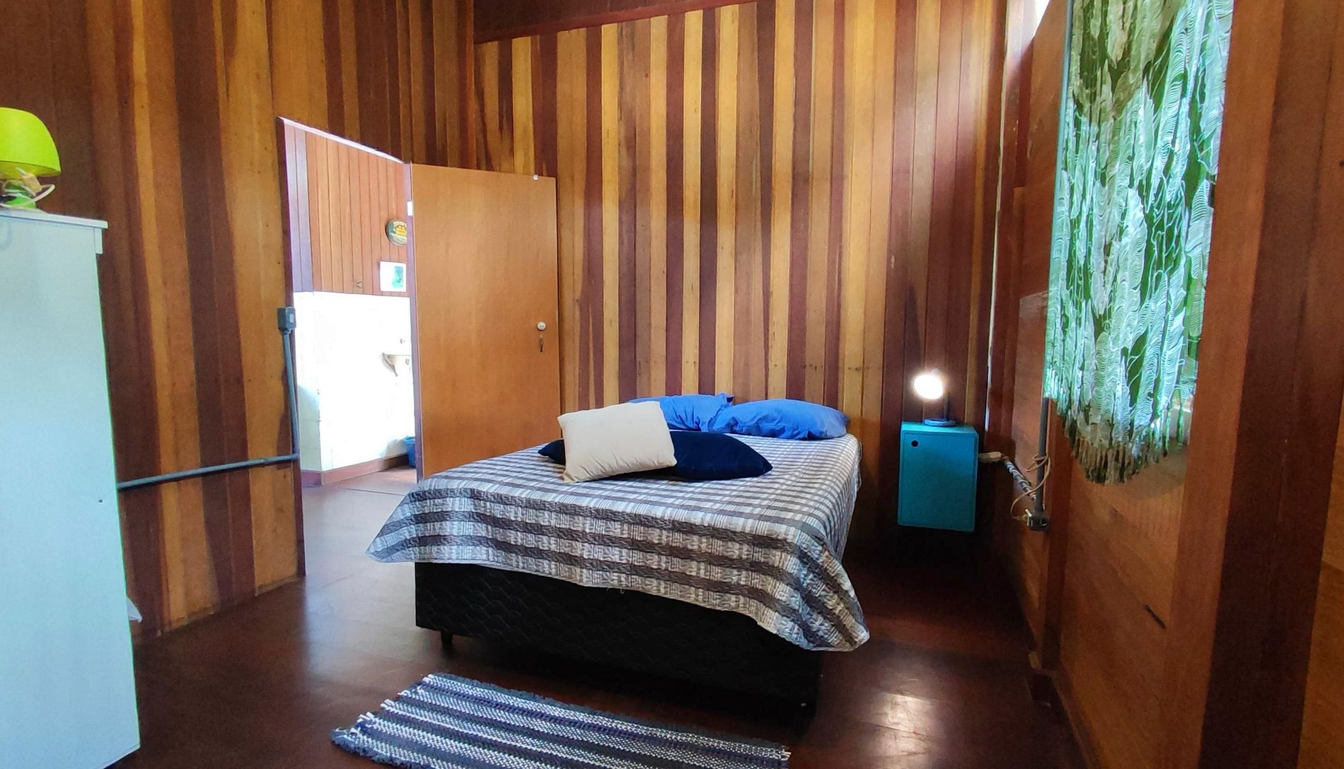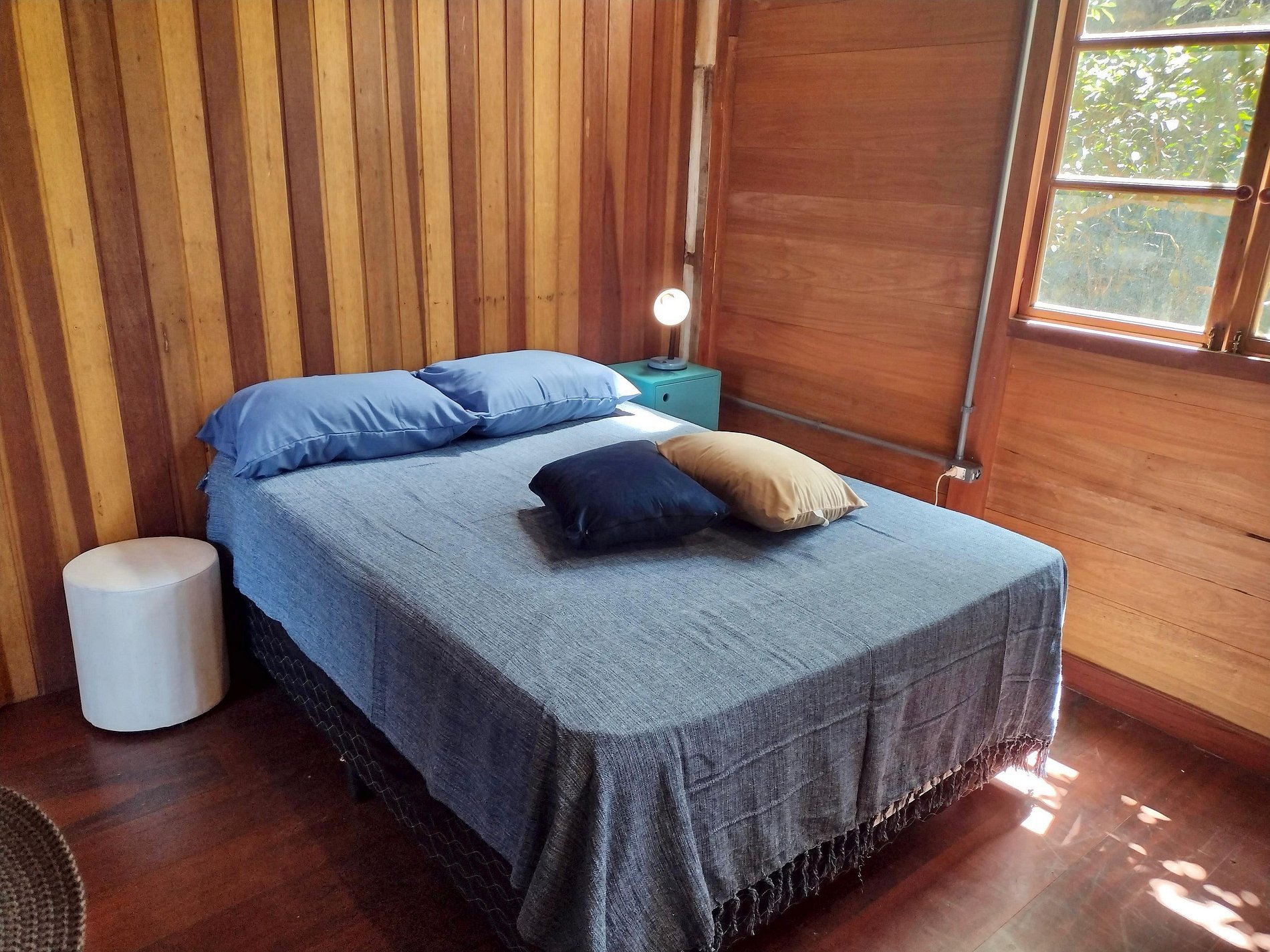 Quarto 2: cama de solteiro, ventilador de chão e vista para a mata.