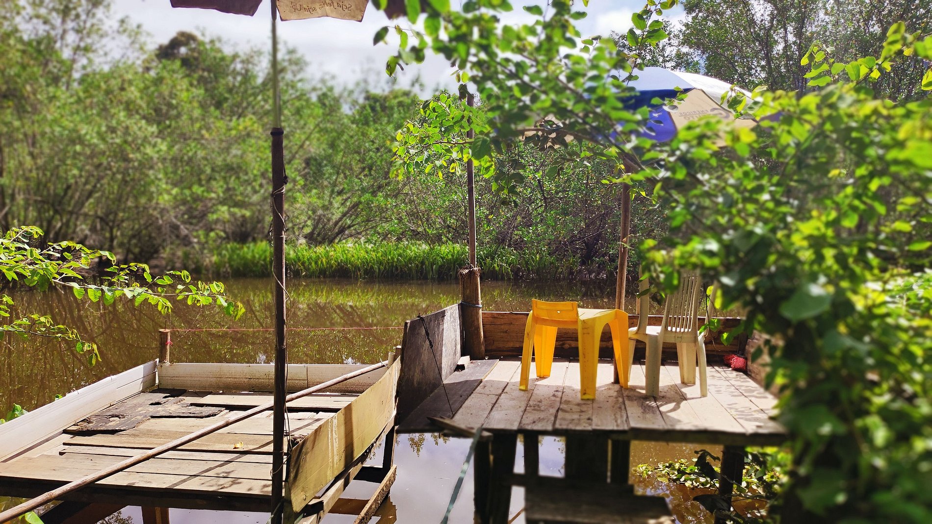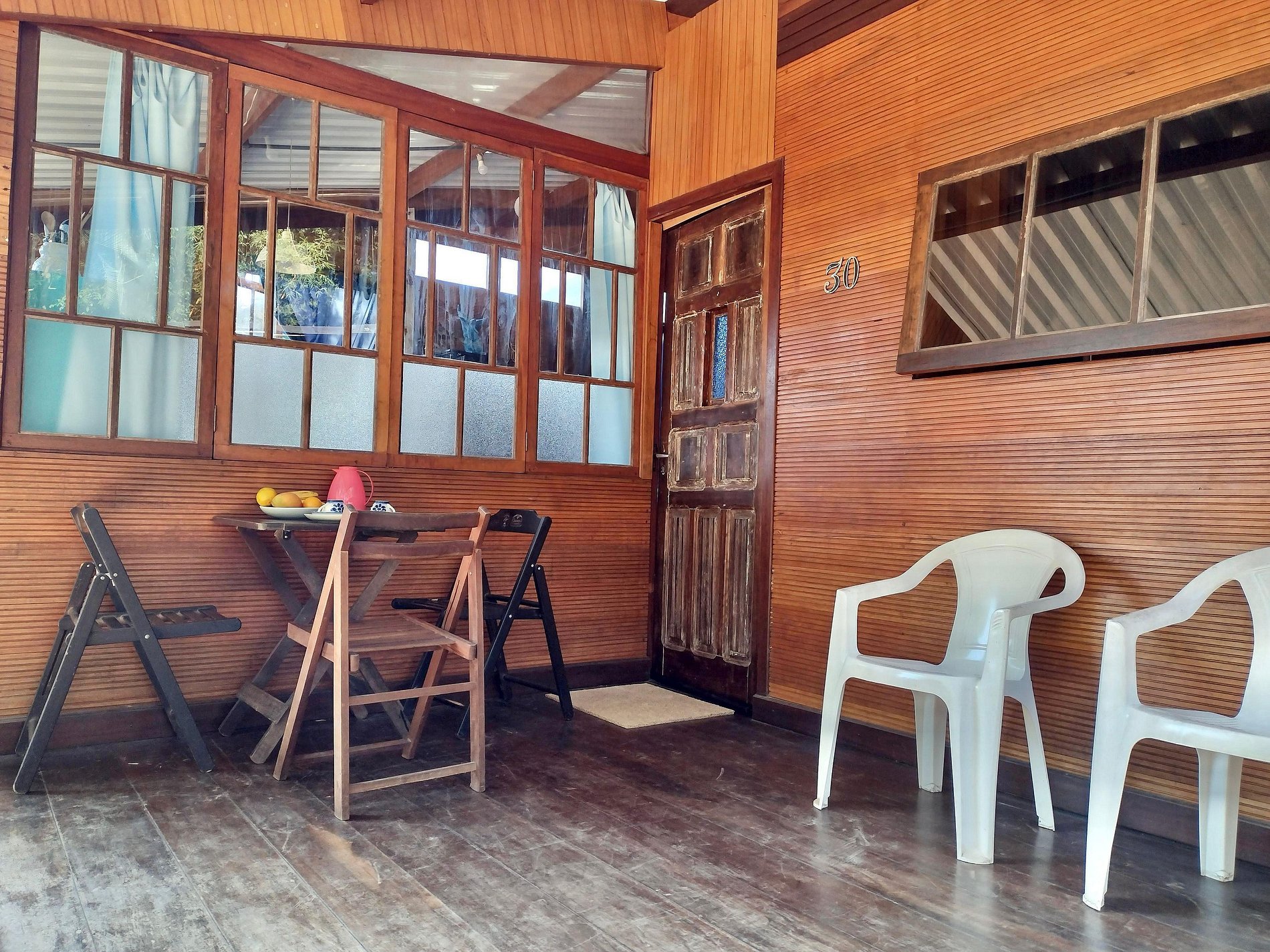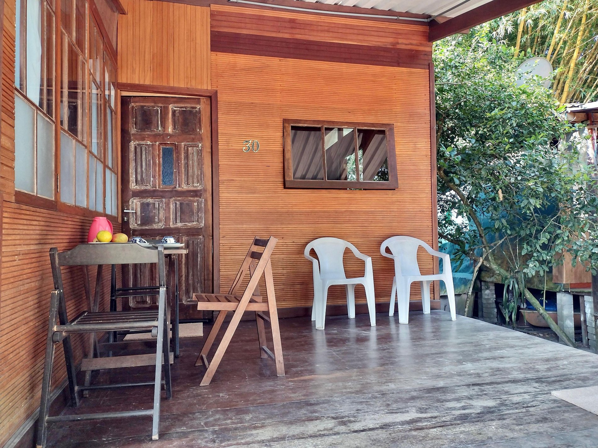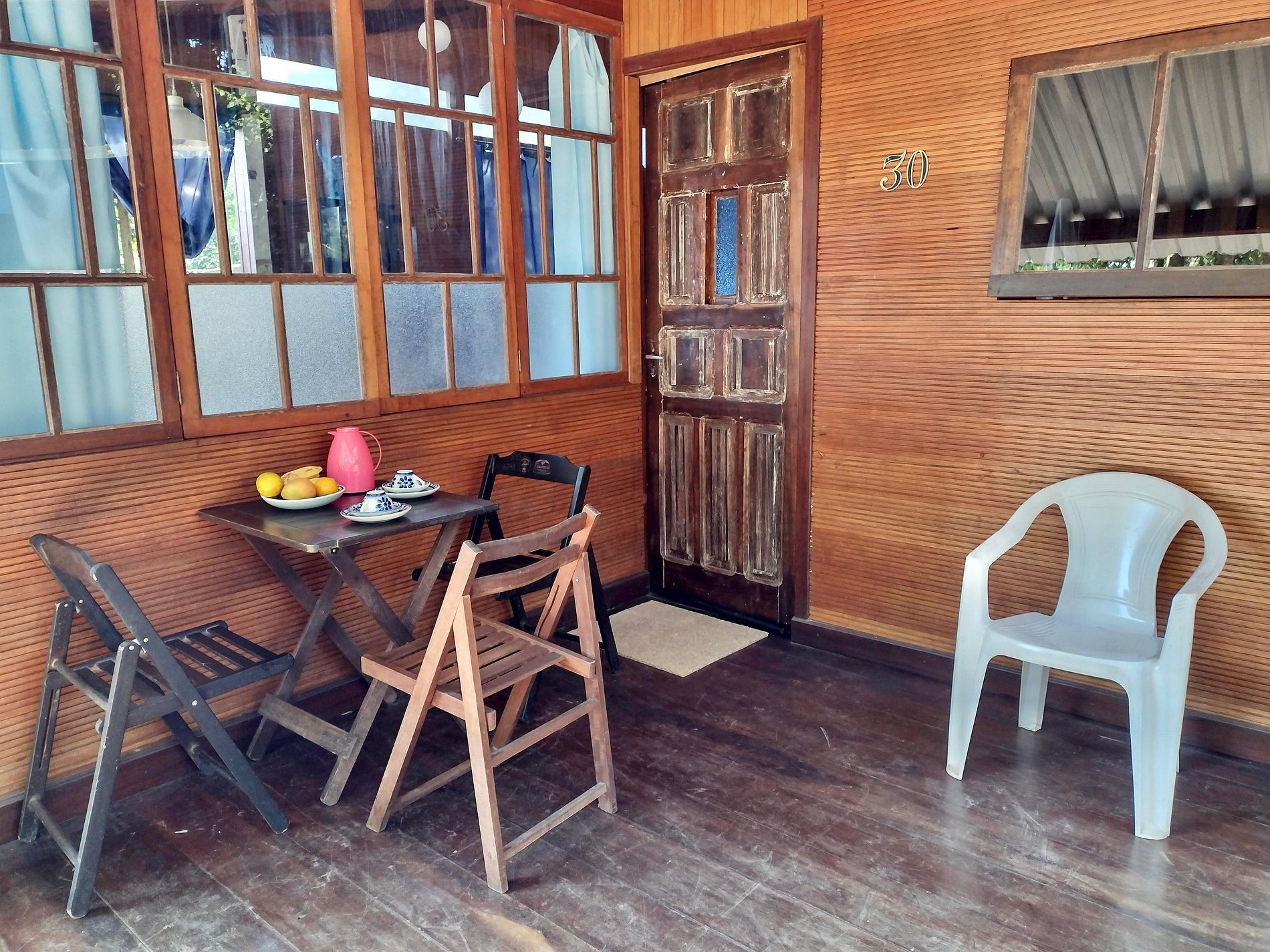 Varanda: com mesa, cadeiras e churrasqueira portátil, cadeiras de praia e guarda sol.
